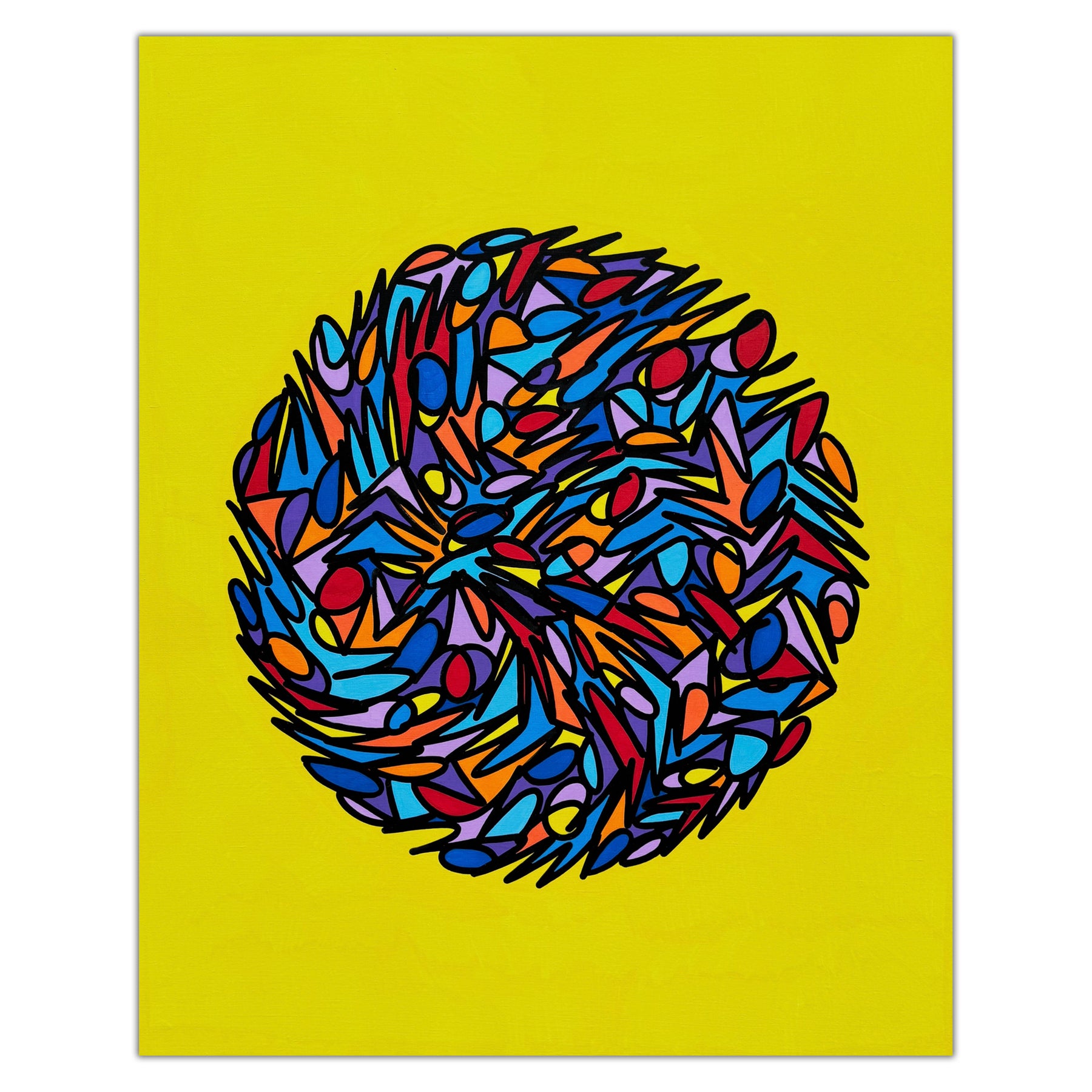 Pour cette nouvelle exposition, Arthur présente une série inédite de toiles, dessins et œuvres sur papier - du petit haïku à la méga-spirale - où ses lignes noires caractéristiques se mêlent à des aplats de couleurs vives. Les lettres se lient, se superposent, se transforment en motifs presque abstraits.