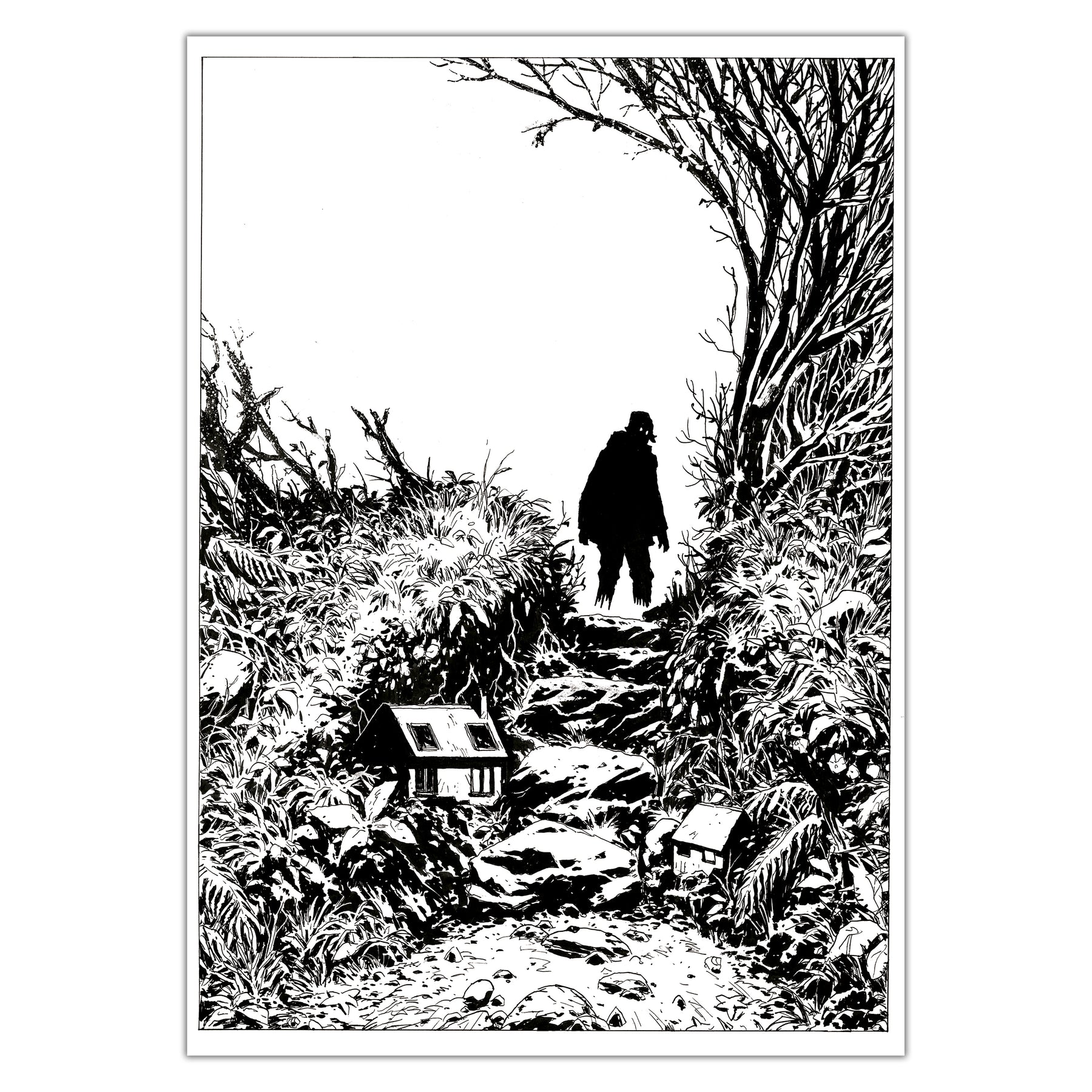 Révélé lors de notre exposition collective dédiée aux 13 ans du Label 619 (2021), Jérémie Gasparutto revient aujourd’hui avec une exposition personnelle : une sélection de planches originales issues de son nouveau one shot Le Chemin Derrière la Maison, publié au Label 619 en janvier 2026.